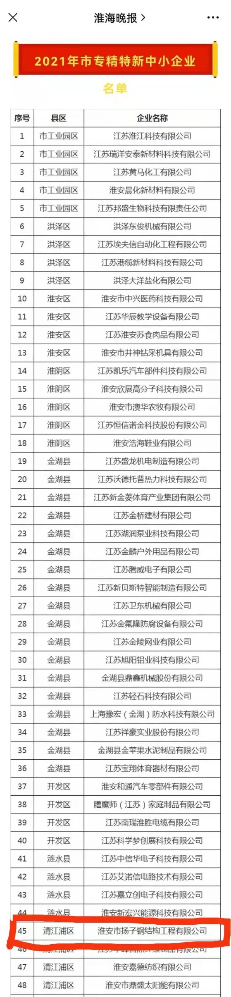 “專精特新”中小企業(yè)是指具備專業(yè)化、精細(xì)化、特色化、新穎化四大優(yōu)勢的中小企業(yè),是推動社會經(jīng)濟(jì)社會發(fā)展的重要力量。在政府高度重視引導(dǎo)中小企業(yè)走“專精特新”發(fā)展道路進(jìn)程中,淮安揚(yáng)子鋼構(gòu)通過多年的不懈努力,此次成功入選淮安市“專精特新”中小企業(yè)。這既是對我司在技術(shù)創(chuàng)新、產(chǎn)品服務(wù)和發(fā)展前景等方面的認(rèn)可與肯定,也是對我們企業(yè)未來的發(fā)展提出了更高的要求。 揚(yáng)子鋼構(gòu)在今后的發(fā)展中,將堅(jiān)持“專精特新”的主旨,明確目標(biāo),聚焦主業(yè),肩負(fù)更多的社會責(zé)任,奮發(fā)圖強(qiáng)、努力進(jìn)取,進(jìn)一步提高企業(yè)品牌知名度、行業(yè)影響力和市場競爭力,為實(shí)體經(jīng)濟(jì)發(fā)展作出更大的貢獻(xiàn)。