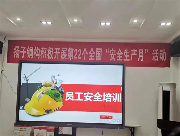 揚子鋼構(gòu)堅持將安全發(fā)展的理念灌輸?shù)焦镜拿恳粋€人,倡導大家共同努力,從身邊點滴做起,不粗心、不違章操作、用心想細心做,牢記生命是愛的保障、用安全譜寫生命樂章,切實將“安全生產(chǎn)月”活動做深、做實、做細。
