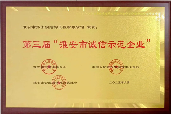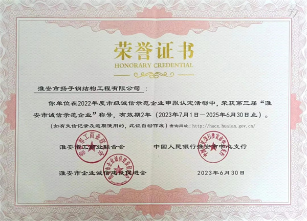 近日,淮安市揚(yáng)子鋼結(jié)構(gòu)工程有限公司(以下簡(jiǎn)稱“揚(yáng)子鋼構(gòu)”)在2022年度市級(jí)誠(chéng)信示范企業(yè)申報(bào)認(rèn)定活動(dòng)中,榮獲第三屆“淮安市誠(chéng)信示范企業(yè)”稱號(hào)。